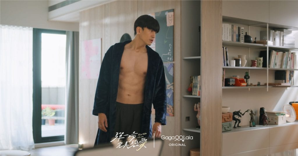 劉泯廷浴袍半開大秀肌肉,荷爾蒙爆發。(圖/GagaOOLala提供) BL影集《彈一場完美戀愛 First N..